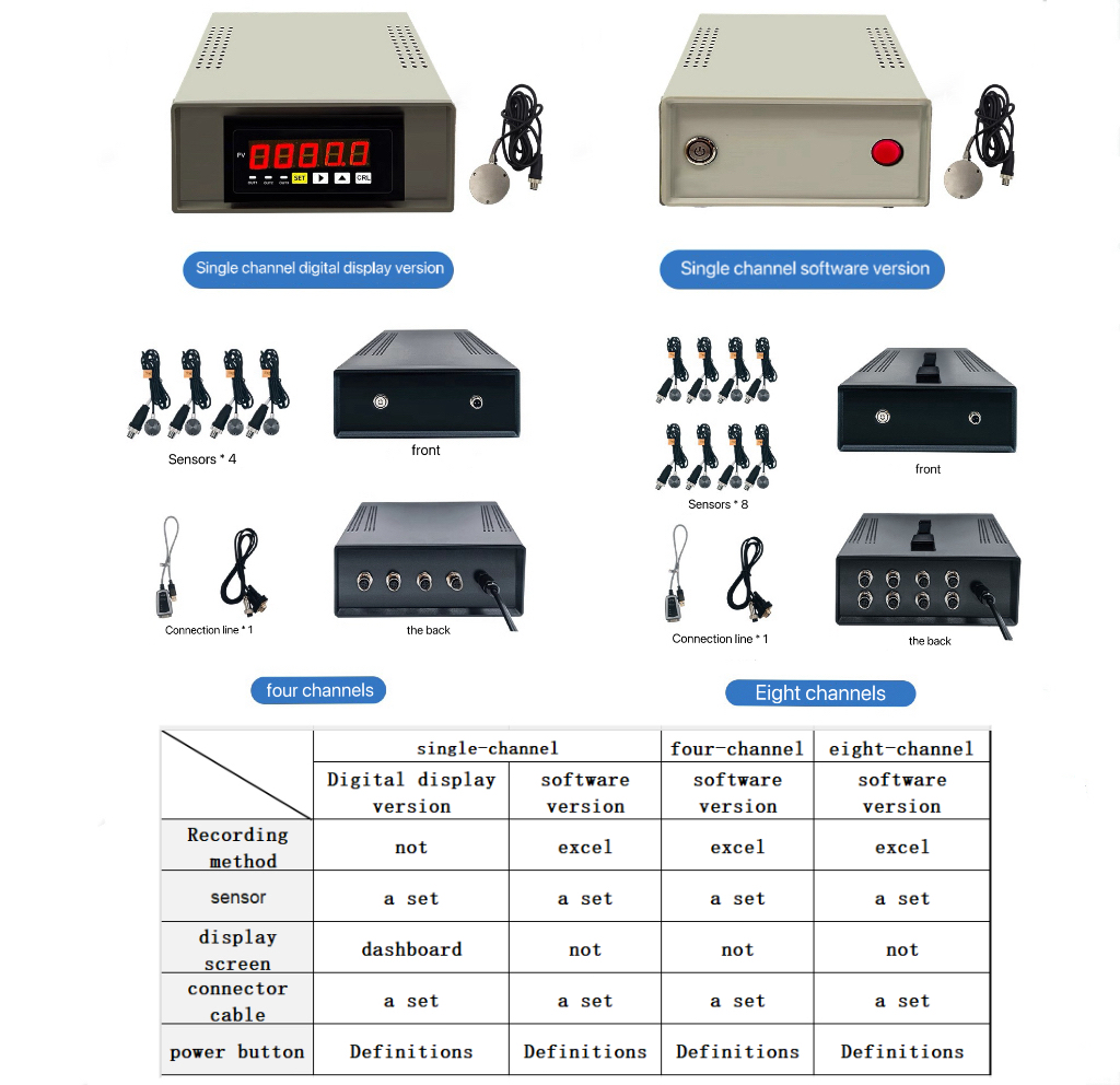 Single channel digital display version, Single channel software version, Four channel software version, Eight channel software version