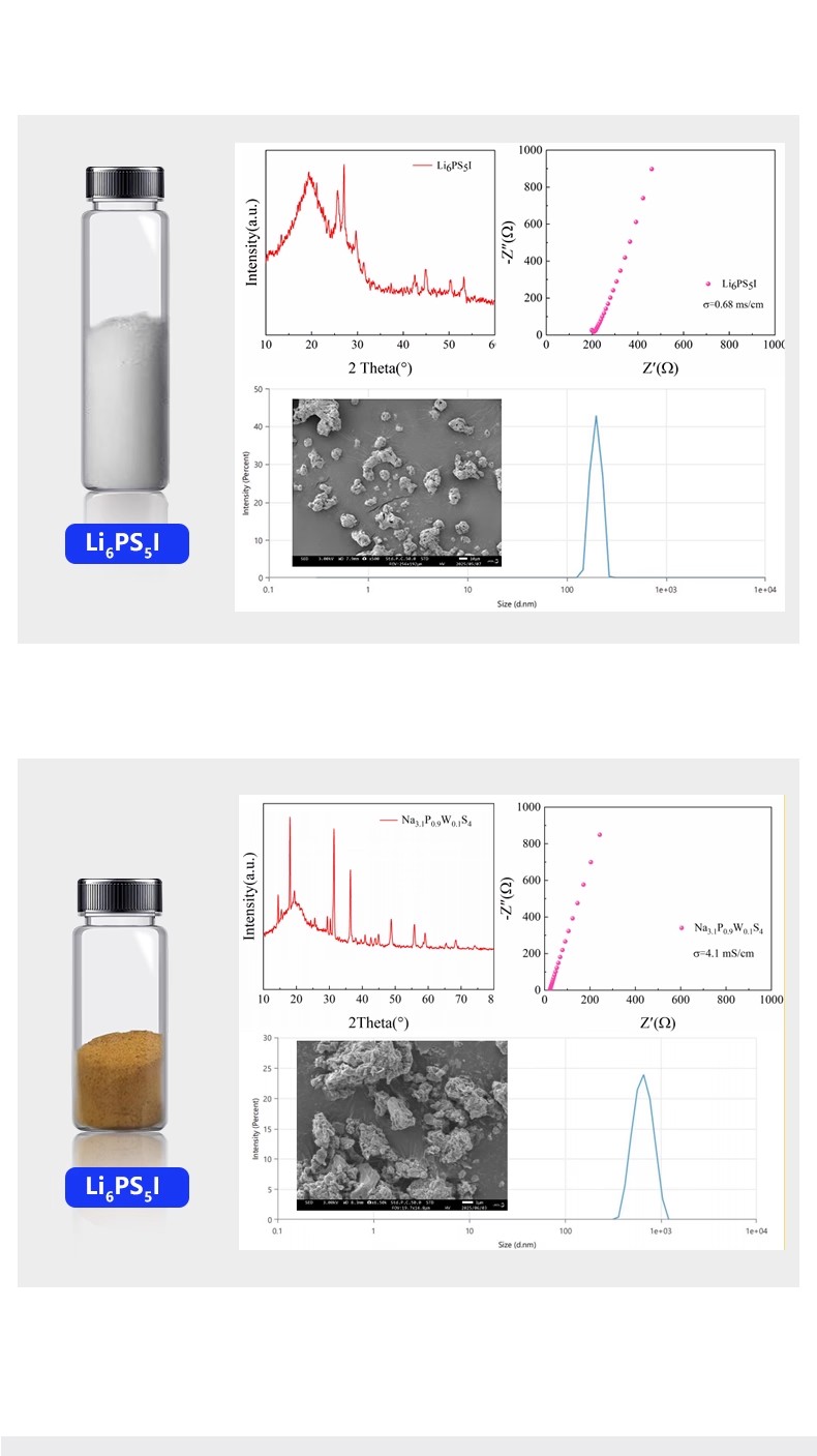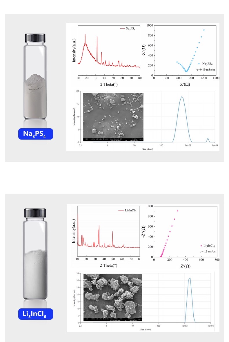 LPSCl(1.5 μm), Li3PS4(2-20μm), Li10GeP2S12(1-10um), LiSiPSCl(2-20um), Li3InCl6(2-10μm), Li2ZrCl6(1-10μm), Li2In1/3Sc1/3Cl4(1-10μm), Li7P3S11(1-10μm), Na3PS4(800 nm), NPSCl(1-5μm), Li6PS5Cl(2um), Li6PS5I(500nm), Na3.1P0.9W0.1S4(1um)